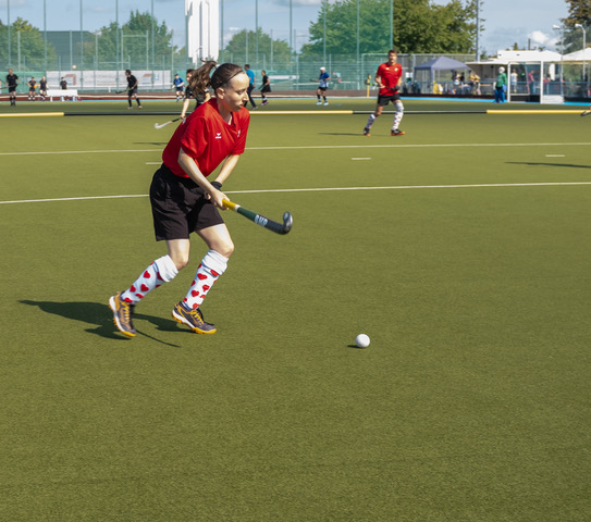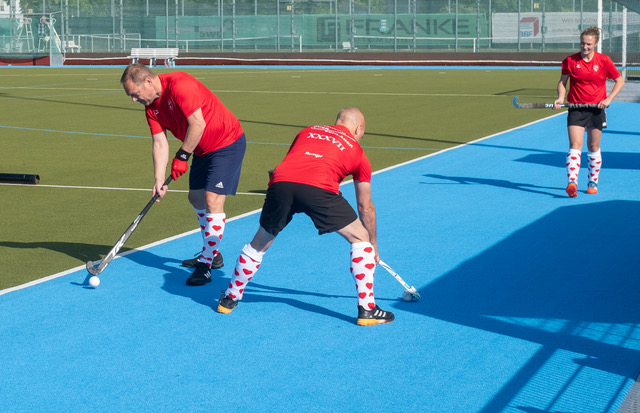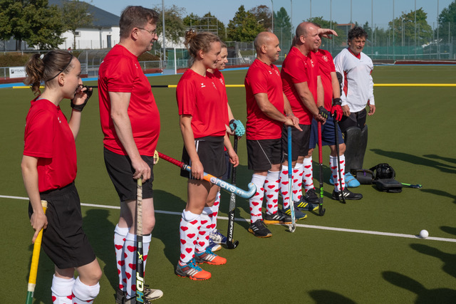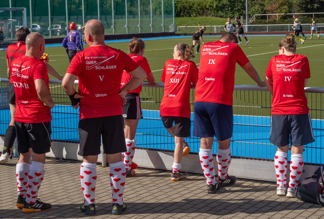Die Querschläger haben sich ein neues Outfit gegeben. Sieht gut aus.  Insbesondere die Stutzen – rote Herzchen auf weißem Grund- sind der absolute Hingucker.  Das ist im Bezug auf ein gelingendes Turnier schon mal die halbe Miete. Die andere Hälfte hat mit Bewegung auf dem Platz zu tun. Elliot stimmt uns dafür auf eine offensive Spielweise ein. Den Ball in der gegnerischen Hälfte erobern und so das Spiel kontrollieren, über außen zum Schusskreis, Torschuss, so soll es sein.