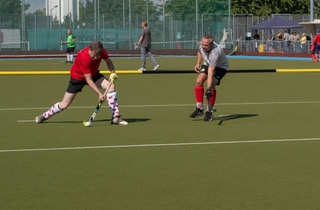 Kaum hat die Feldsaison angefangen, ist schon wieder Gloriosa-Cup. Bedingt durch einige Absagen ist unsere Personaldecke eher dünn. Zudem ist, nach nur zwei kleinen Einheiten in Tröbsdorf, beim Trainingsstand gewiss noch Luft nach oben. Doch Erfurt empfängt uns mit bestem Wetter und Bratwurstduft. Es soll ein schönes Turnier werden. Neben der kompletten Thüringer Riege (Weimar, Jena, Erfurt) sind Mannschaften aus Sachsen, Sachsen-Anhalt und Hessen angereist. Gespielt wird in zwei Staffeln nach den Regeln des Elternhockey. Das Los beschert uns zum Auftakt die Schnapphänse aus Jena. Wir sind, wie schon des Öfteren im ersten Spiel, noch nicht so richtig auf dem Feld. Erst mal auf dem Kunstrasen ankommen, ein paar Spielzüge ausprobieren und dann weiter sehen. Die Jenenser sind gut vorgewärmt und machen das Spiel. Wir setzen Schnelligkeit und Kampfgeist ein. Das bringt Freude ins Spiel und ist, zumindest aus Sicht des Torhüters, auch schön anzuschauen. Tore ernten wir jedoch nicht.  Ein beherzt vereitelter Siebenmeter hilft uns am Ende auch nicht weiter. Wir müssen uns mit 0:2 geschlagen geben.
